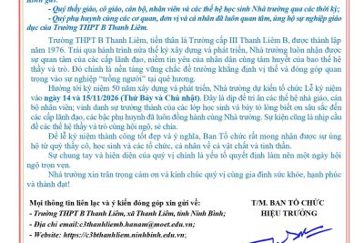Video đồng diễn của trường B Thanh Liêm Đồng diễn võ VOVONAM Sáng 27/3/2026, thực hiện kế hoạch của Sở Giáo dục và Đào tạo tỉnh Ninh Bình, Trường THPT B Thanh Liêm đã tham gia hoạt động đồng diễn võ Vovinam cùng học sinh trên địa bàn toàn tỉnh. Hoạt động nhằm đẩy mạnh phong trào rèn luyện thể chất, nâng cao sức khỏe và giáo dục ý... ...