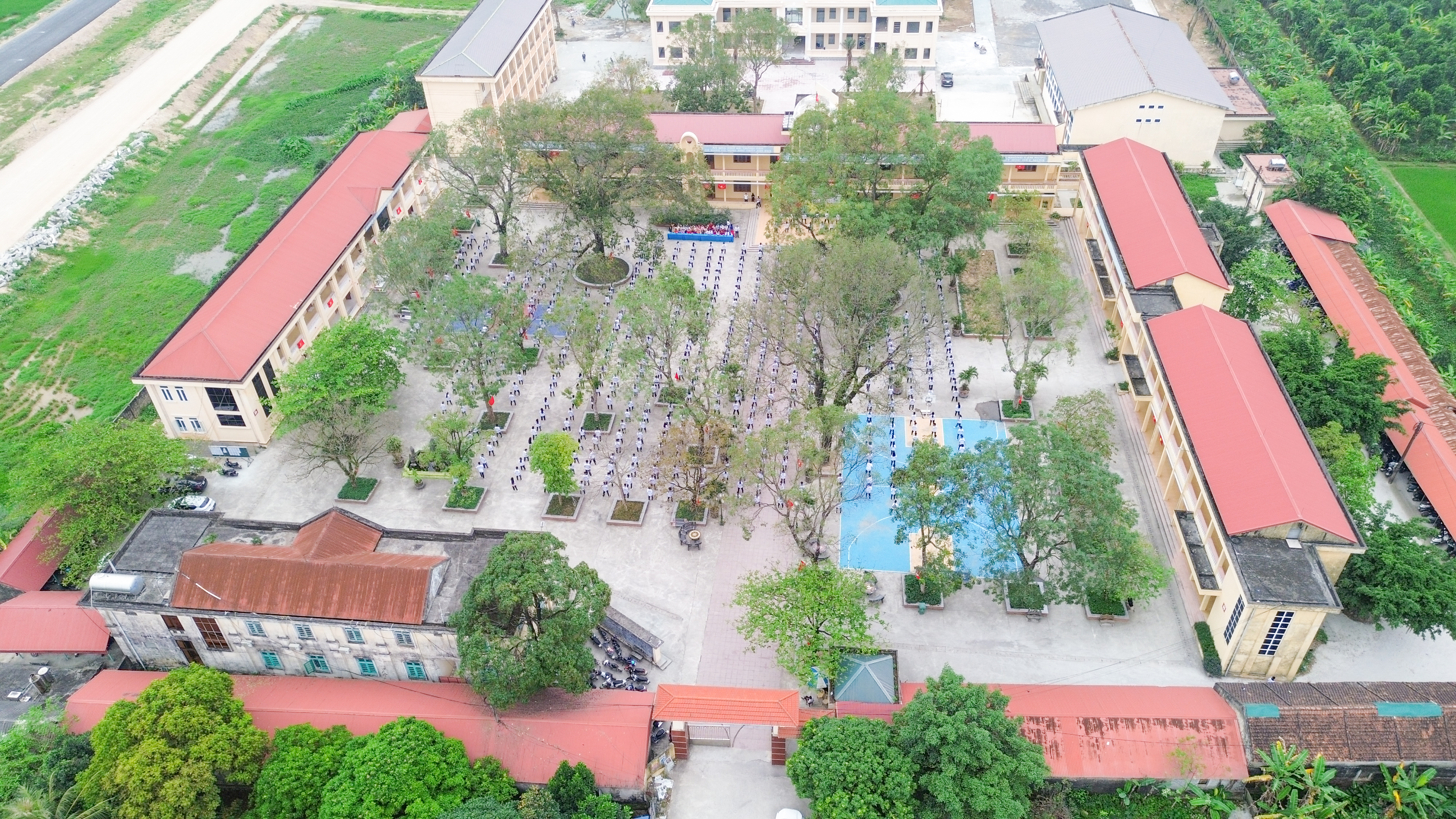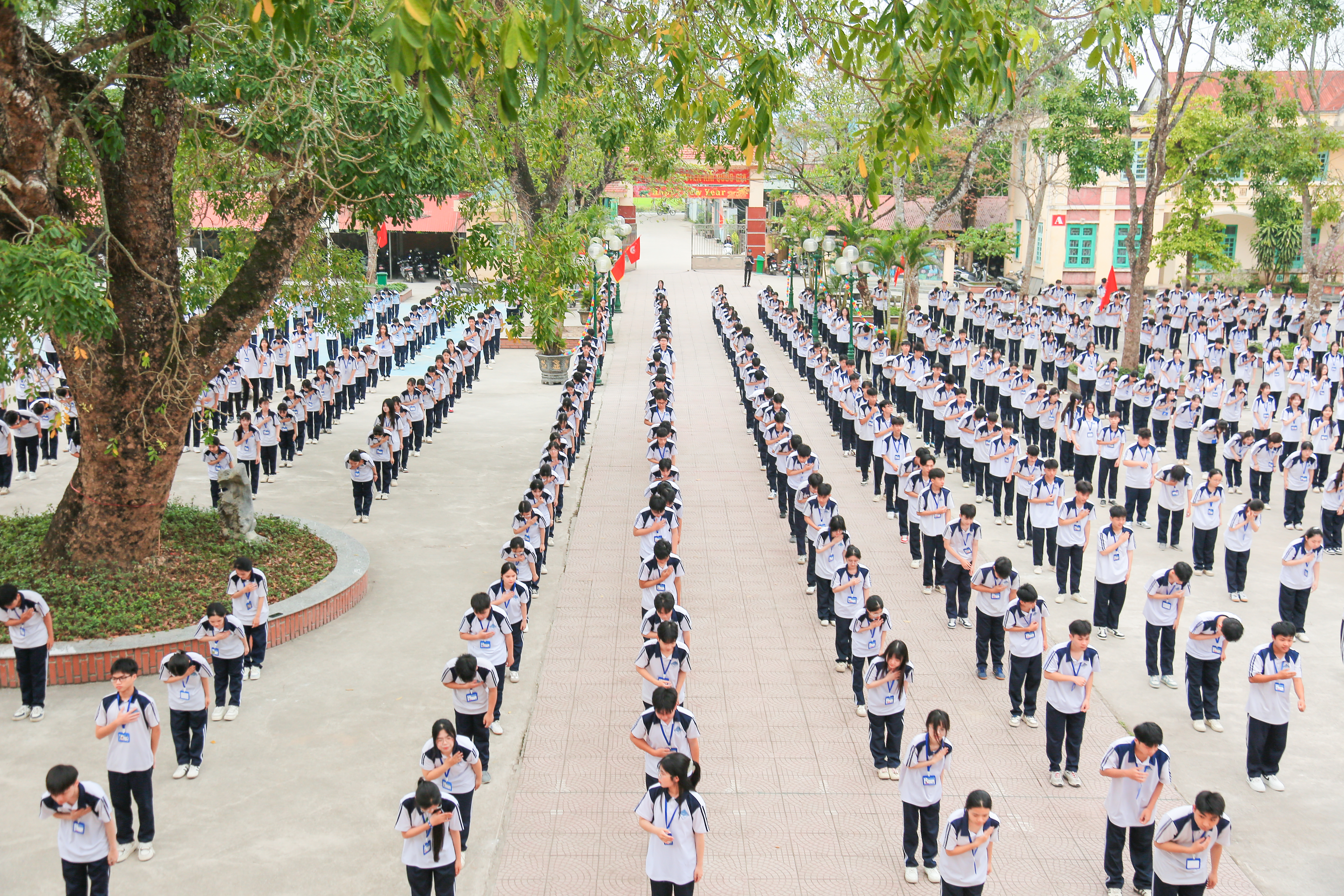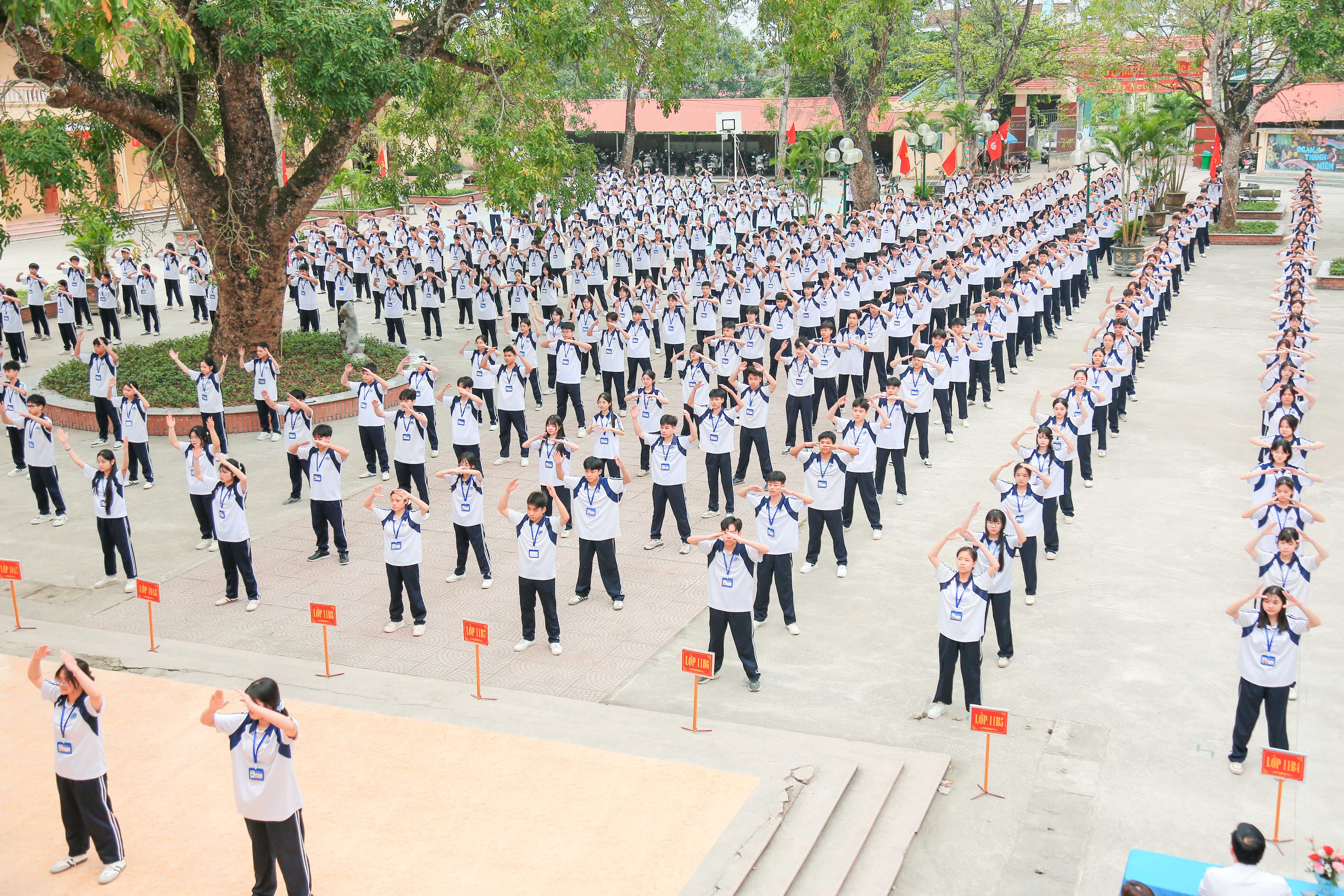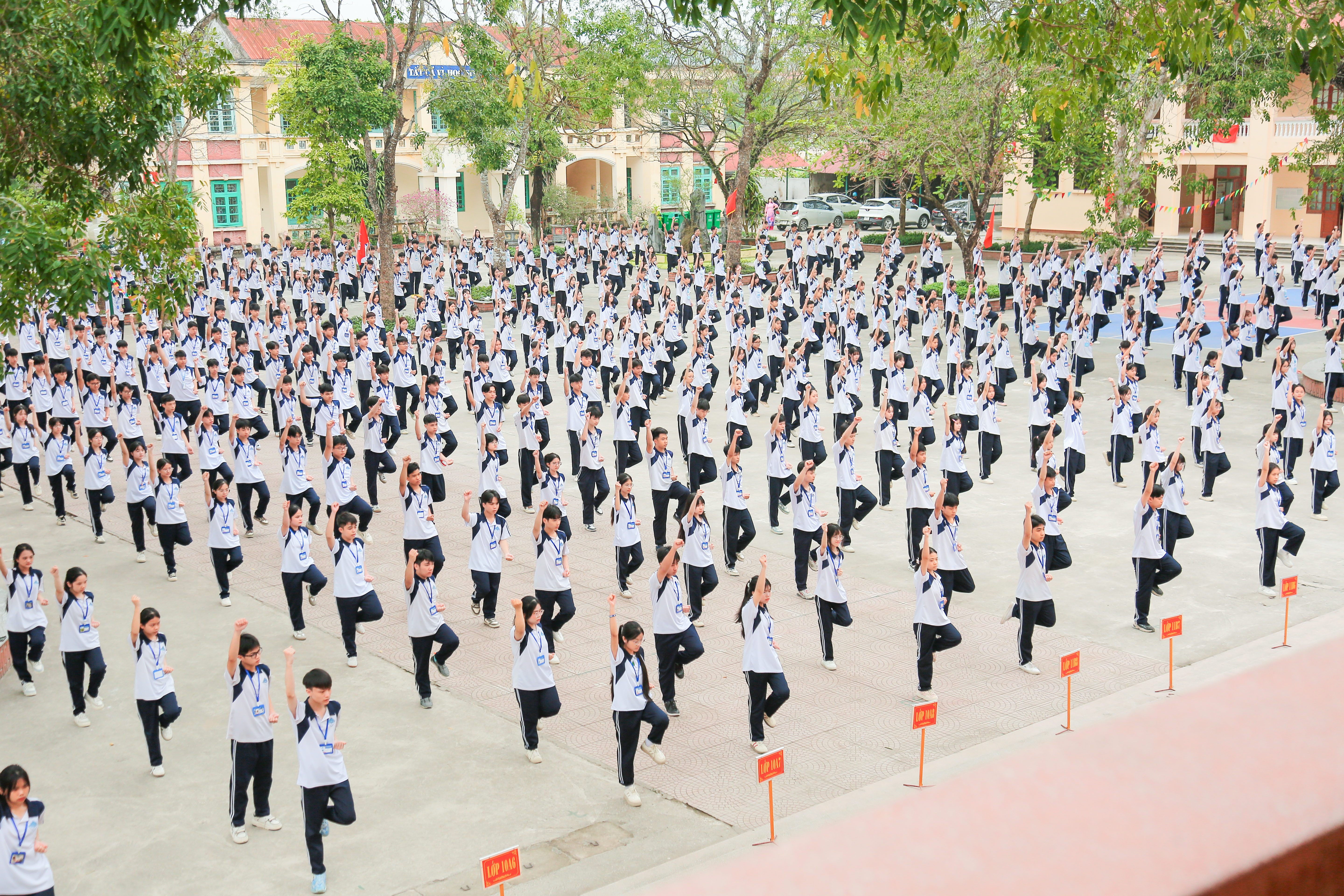 Hàng trăm học sinh trong trang phục thể thao thống nhất, xếp thành các khối ngay ngắn, tạo nên hình ảnh đẹp mắt, thể hiện rõ tinh thần đoàn kết và tính tổ chức cao. Các động tác được thực hiện nhịp nhàng, góp phần lan tỏa hình ảnh năng động, khỏe khoắn của học sinh nhà trường.