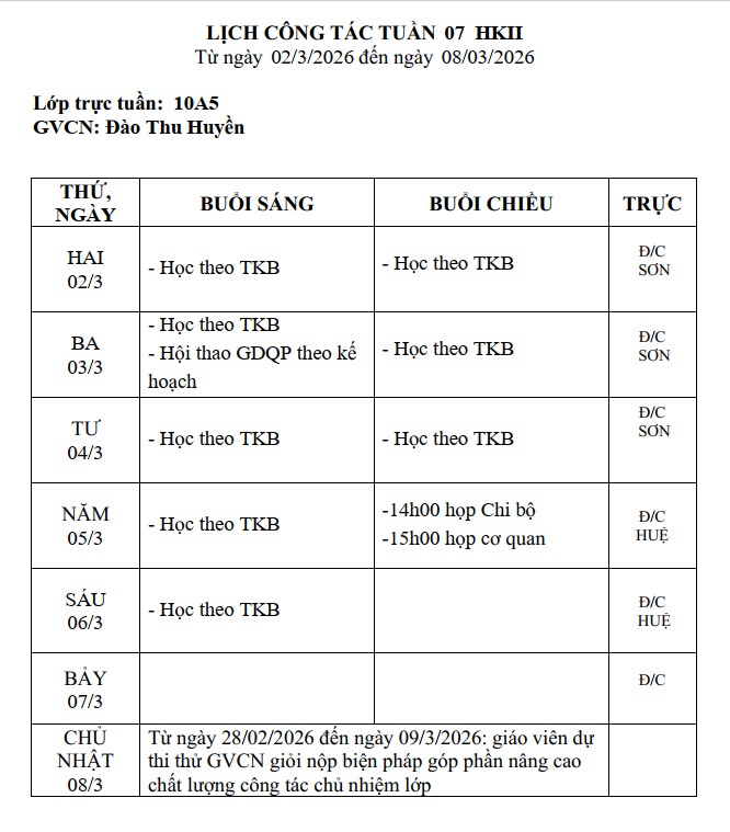 Lịch công tác tuần 07 – HKII